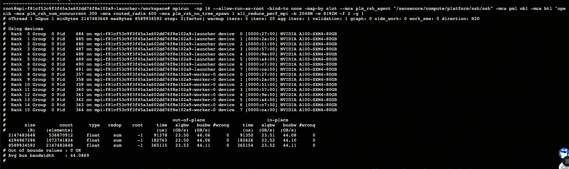 在算力池上提交一个2*8的MPI任务,用户做多机通信库检测,启动命令如下: