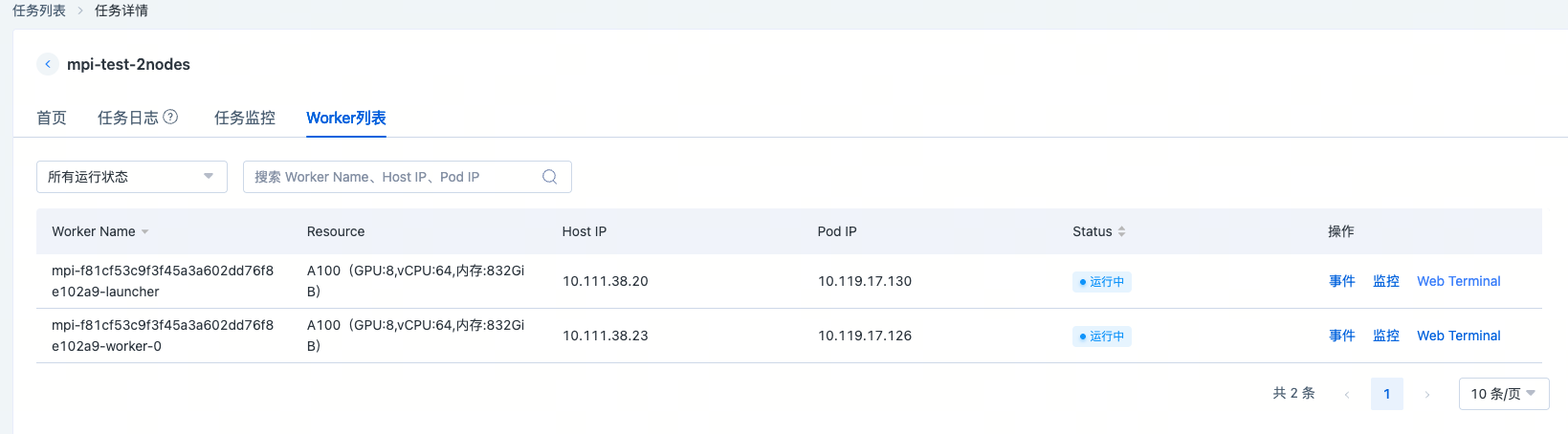 在算力池上提交一个2*8的MPI任务,用户做多机通信库检测,启动命令如下: