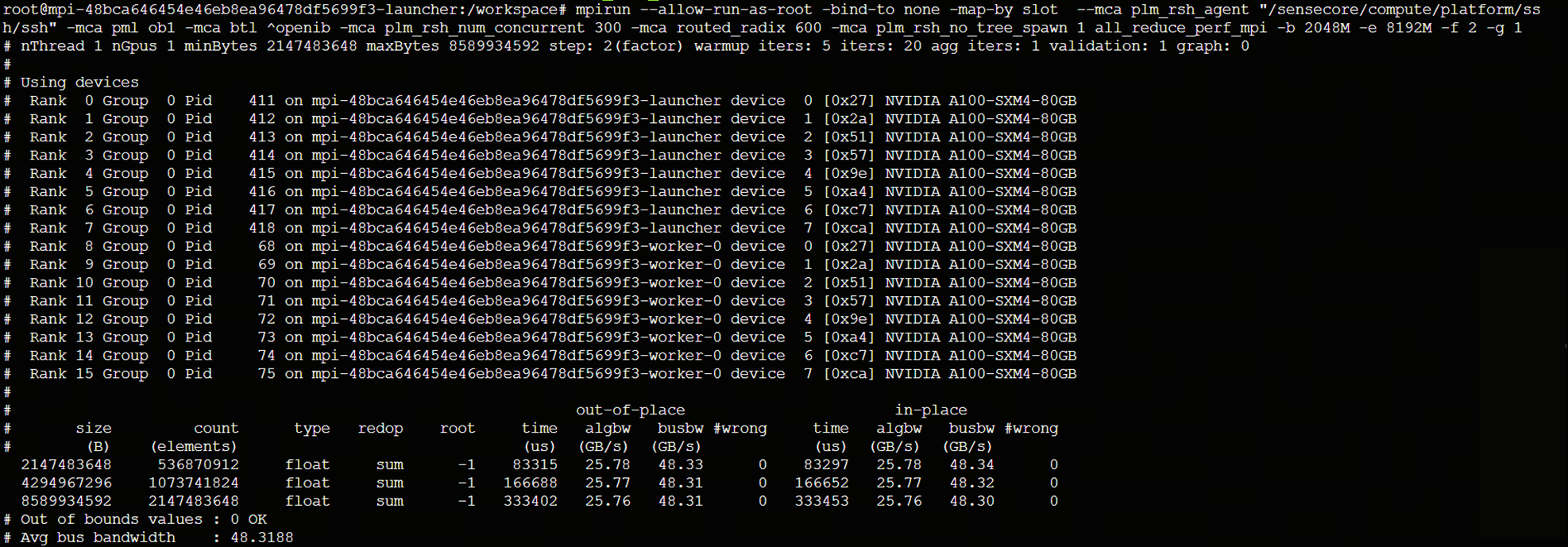 操作指令:mpirun --allow-run-as-root -bind-to none -map-by slot --mca plm_rsh_agent "/sensecore/compute/platform/ssh/ssh" -mca pml ob1 -mca btl ^openib -mca plm_rsh_num_concurrent 300 -mca routed_radix 600 -mca plm_rsh_no_tree_spawn 1 all_reduce_perf_mpi -b 2048M -e 8192M -f 2 -g 1