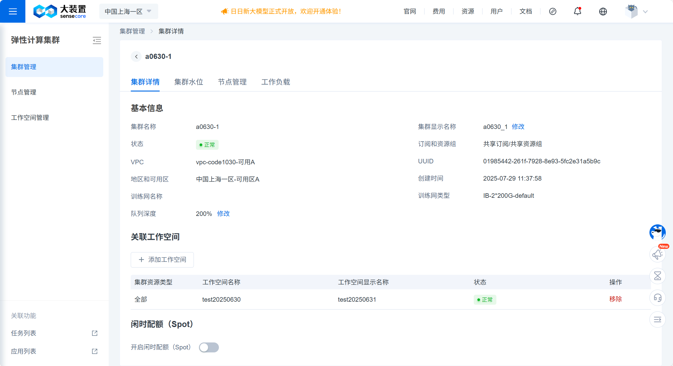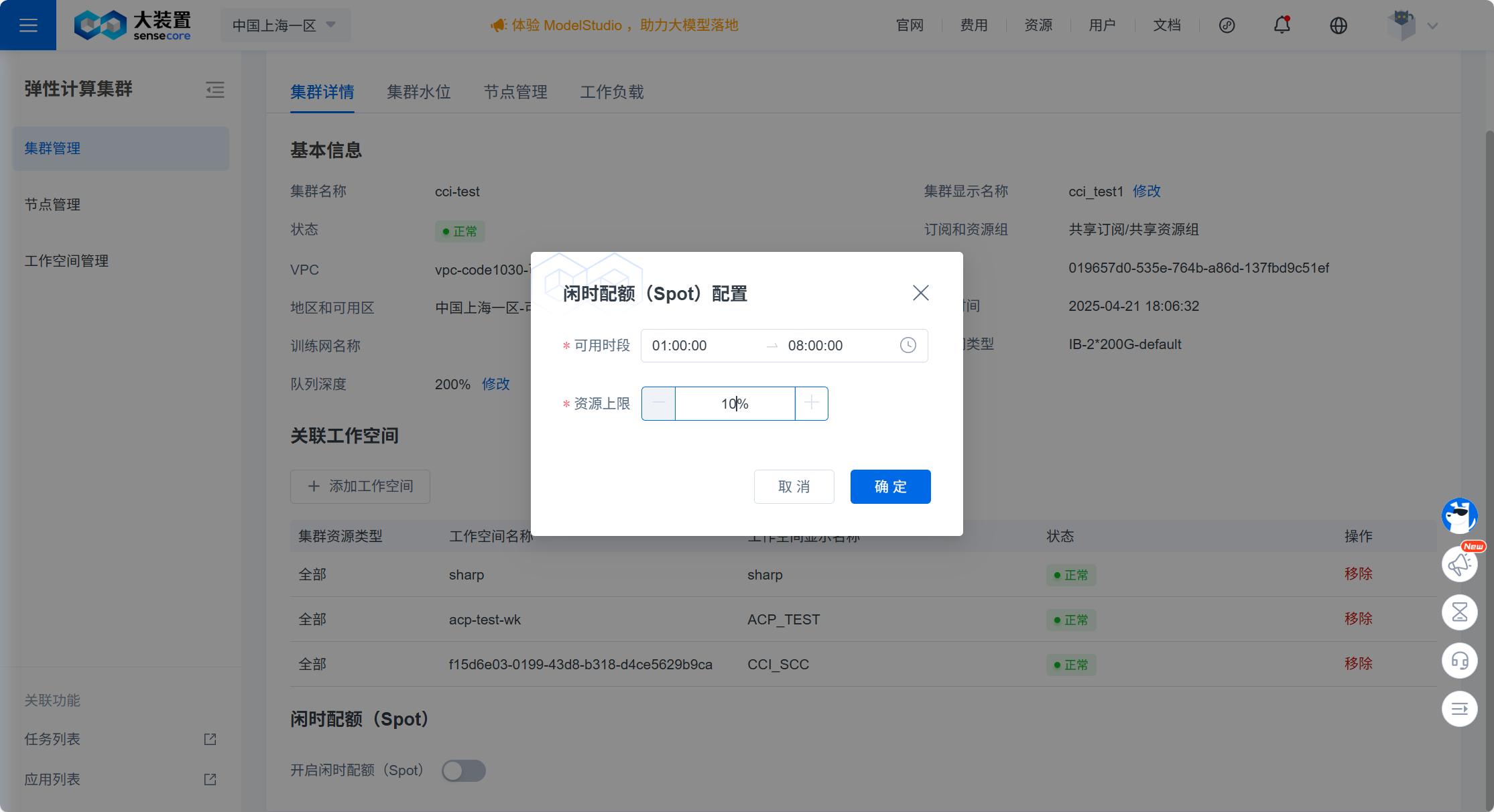 在集群管理界面打开闲时配额开关,并在仅Spot资源关联工作空间按钮处,将Spot资源关联到想要共享资源的工作空间。