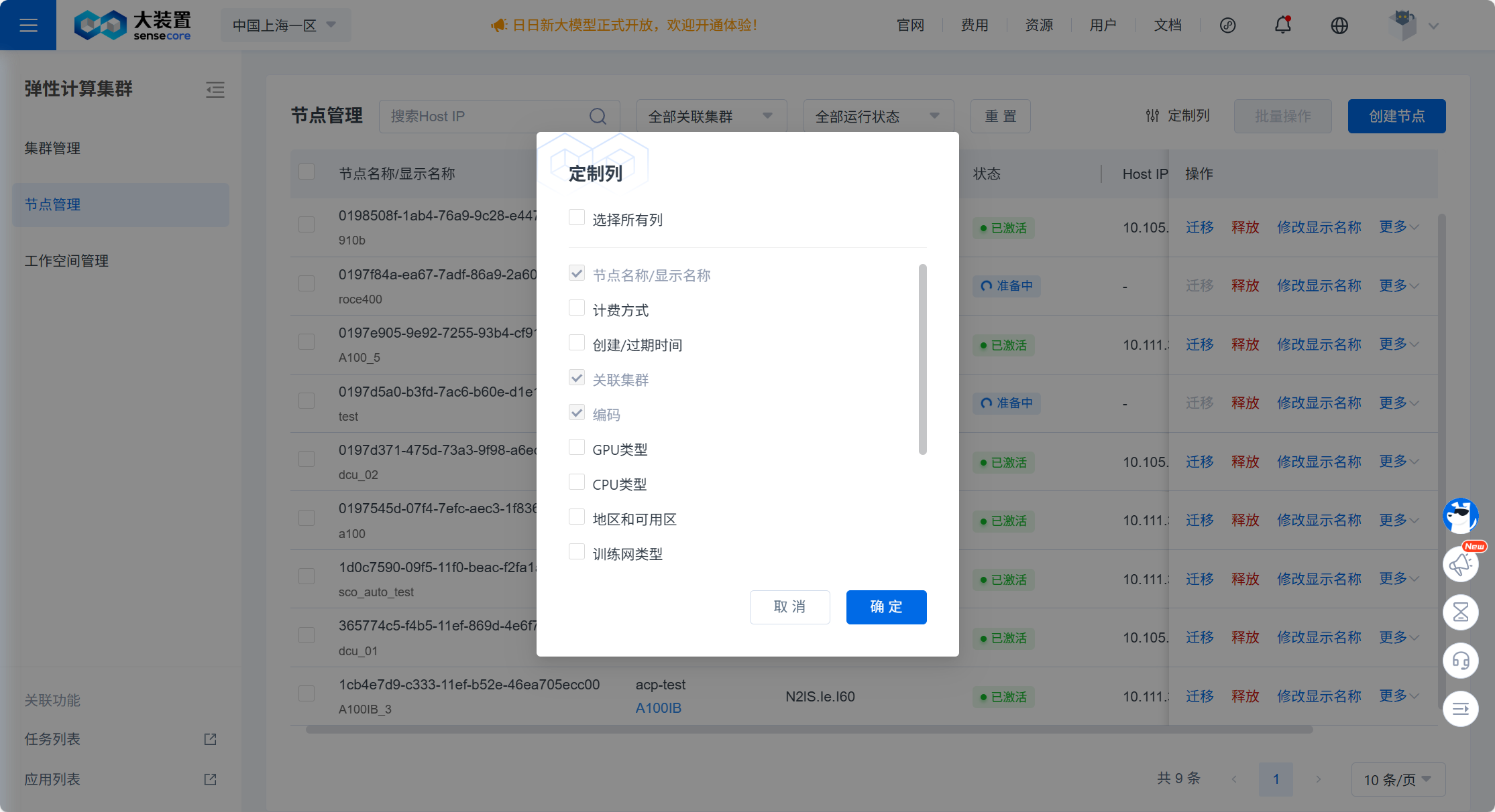 节点列表支持【定制列】展示,用户可以根据自己的需求,点击【定制列】按钮,弹出字段勾选弹窗,定制化展示节点列表信息。