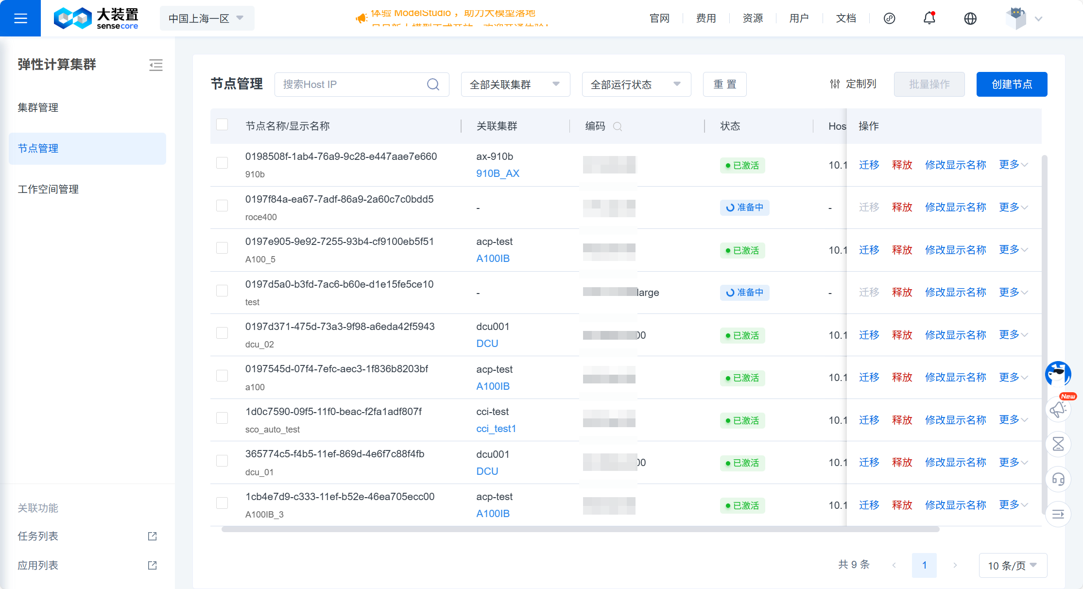 节点管理列表支持用户看节点的基本信息、运行状态、资源配置情况,以及执行相关操作,如迁移、释放、更改显示名称、查看节点监控和工作负载等。