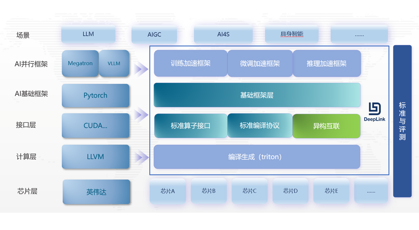 商汤大装置 SenseCore AI 云原生平台融合 DeepLink 方案,全面优化异构算力混合调度、大模型训练和推理加速能力, 并支持智算中心、专有云、私有云独立部署,提升GPU使用效率,为用户提供统一、高效、易用的使用体验。